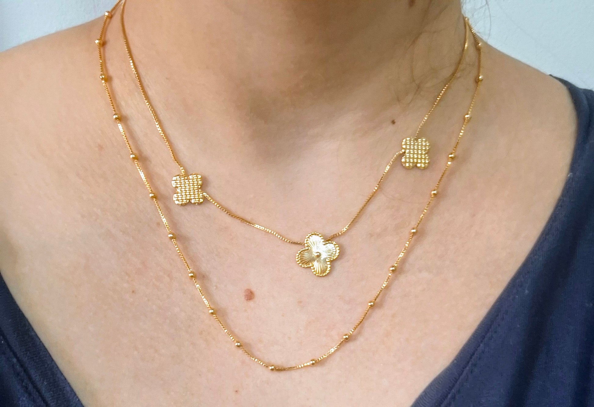 Este colar apresenta um design delicado com um pingente em formato de trevo, adornado por esferas que conferem sofisticação e leveza à peça. Ideal para quem busca um acessório elegante e versátil, ele valoriza qualquer look com um toque de charme e simbolismo, perfeito para uso diário ou ocasiões especiais. Feito com materiais de alta qualidade, garante durabilidade e conforto ao longo do dia.