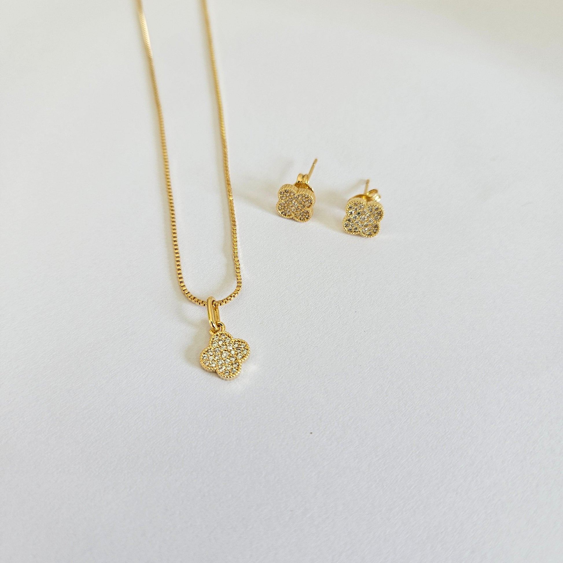 Conjunto Trevo cravejado com corrente de 45 cm, combinando elegância e simbolismo em uma peça versátil. O design de trevo, meticulosamente cravejado com zircônias de alta qualidade, proporciona brilho excepcional e acabamento refinado. Ideal para complementar looks do dia a dia ou ocasiões especiais com um toque de sofisticação.